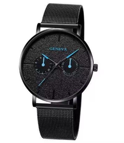 Kjo është një orë elegante nga Geneva, me dizajn minimalist dhe modern. Ka një ekran të zi me detaje blu të lehta, që i japin një pamje të sofistikuar dhe të veçantë. Ofron dy dritare të vogla për funksione shtesë, të vendosura në pjesën e poshtme të ekranit. Rripi metalik në ngjyrë të zezë, me teksturë të hollë, siguron komoditet dhe qëndrueshmëri. Kjo orë është ideale për ata që kërkojnë një stil të përditshëm, por me një prekje të klasit dhe elegancës.