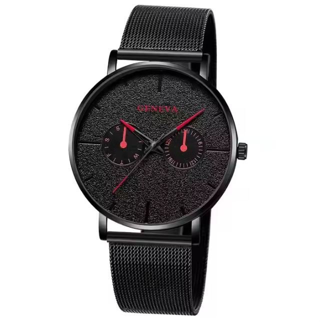 Kjo orë “Geneva” sjell një përzierje të elegancës së zezë dhe aksenteve të kuqe të ndezura, duke e bërë atë një aksesor të sofistikuar dhe modern. Me një sfond të teksturuar dhe tregues minimalë, kjo orë përmban dy nën-shënues funksionalë për datën dhe ditën. Rripi i saj prej çeliku të endur, në ngjyrë të zezë, i shton një prekje të rafinuar dhe rezistencë. Kjo orë është ideale për ata që kërkojnë një stil të thjeshtë, por me personalitet të fortë.