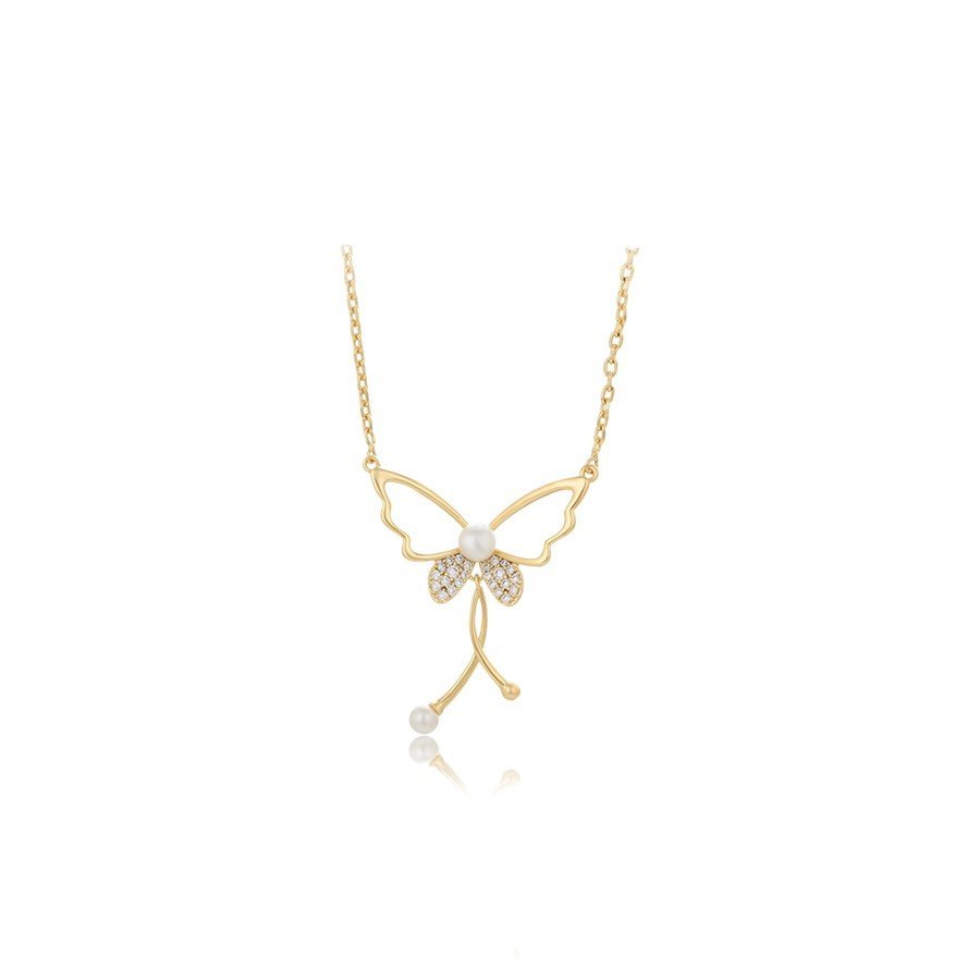 Qafore moderne në formë fluture, e praruar ne ar 14 karatësh me gurë të bardhë sintetik dhe imitim perle.