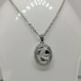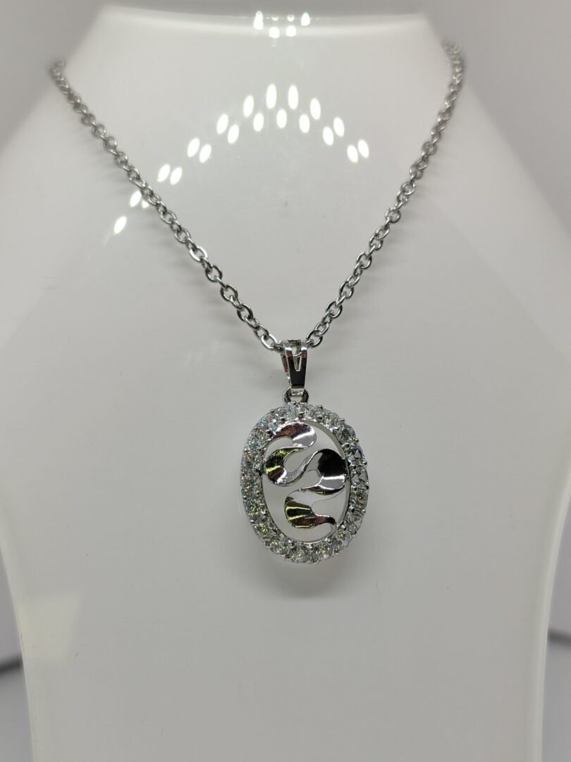 Qafore e flakëruar në argjend me varëse me figurë ovale. E stolisur me gurë të bardhë sintetik.